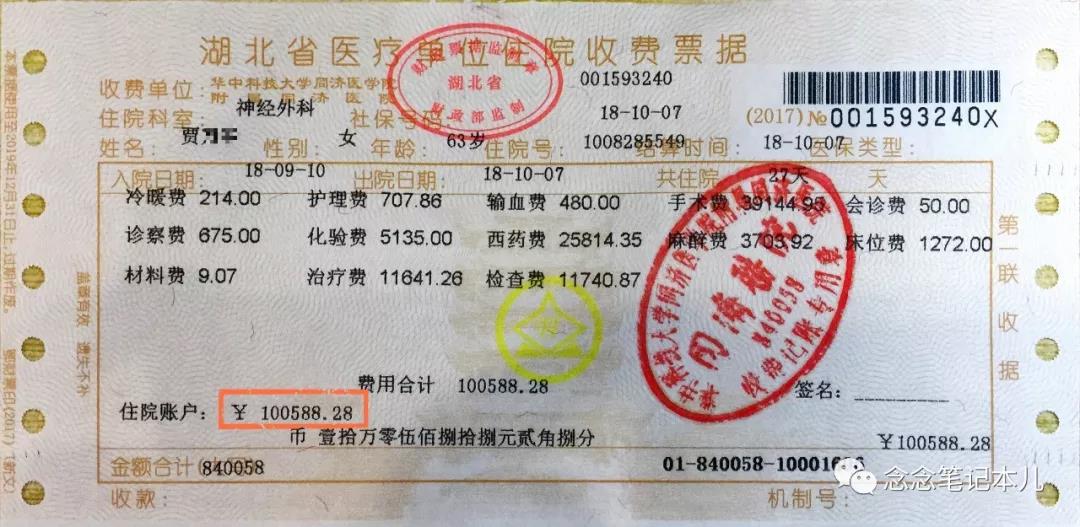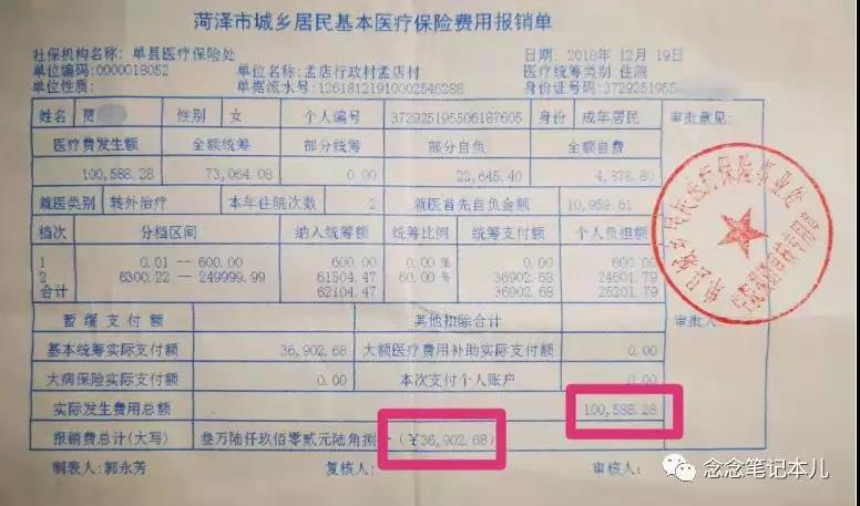1. 第一个案例是我的一位客户,发生了良性脑肿瘤,住院进行手术切除,图一为出院的费用总金额,花费为100588.28元。图二为新农合报销的金额,36902.68,可以核算一下社保报销的比例,大概为36%,可见医保的报销比例确实不算高,很大一部分需要自己负担。