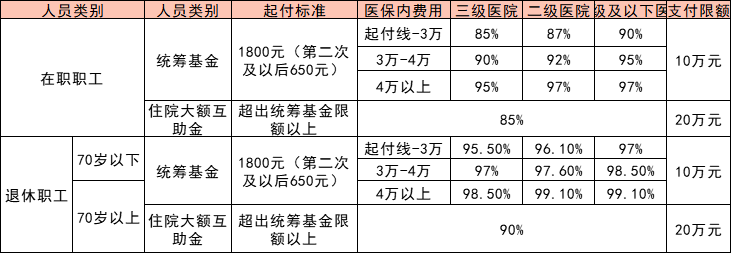 可以看到,起付标准在职职工为1800,退休职工为1300。起付线以上的可以报销,额度是2万元。那报销比例呢,根据医院的等级,报销比例在70%-90%不等。