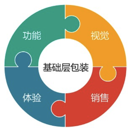我们从盈利型互联网产品的角度,基于以用户为中心的包装策略,尝试将基础层包装分解为四个核心的包装内容:功能元素包装(功能/规格)、视觉设计包装(好看/颜值)、用户体验包装(整体感受)、销售内容包装(性价比)。