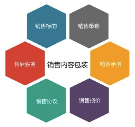 销售内容包装是针对与产品销售相关的所有配套内容的包装,通常包括:客户交付内容、产品销售政策、产品销售手册、产品销售报价、产品销售协议、产品售后服务等。