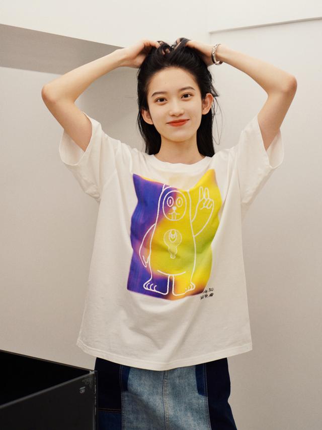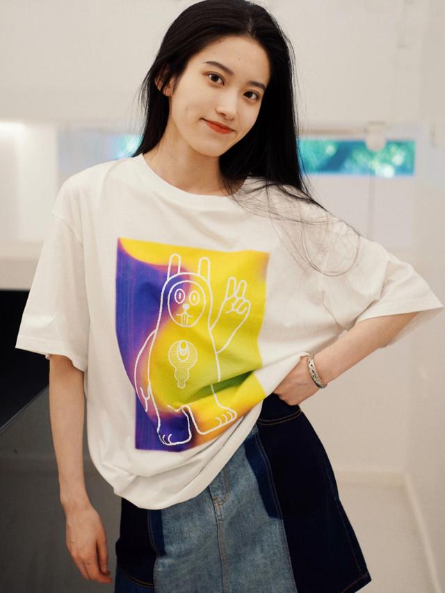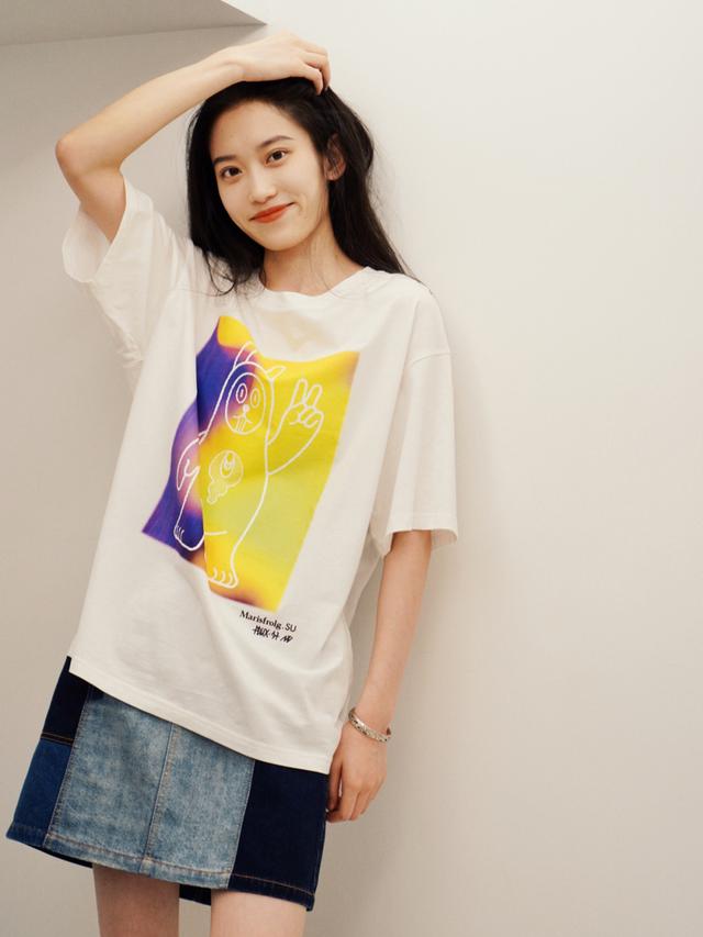 白色印花短T搭配拼接的牛仔半裙,可以让你看起来特别的青春活力,而且宽松的短T看起来会很显手臂的细长,纸片人既视感,而且搭配微A的牛仔半裙,看起来很有设计感,不会像基础款那么单调,有趣好看,而且好很显腿细腿长。