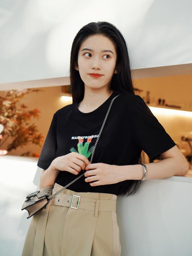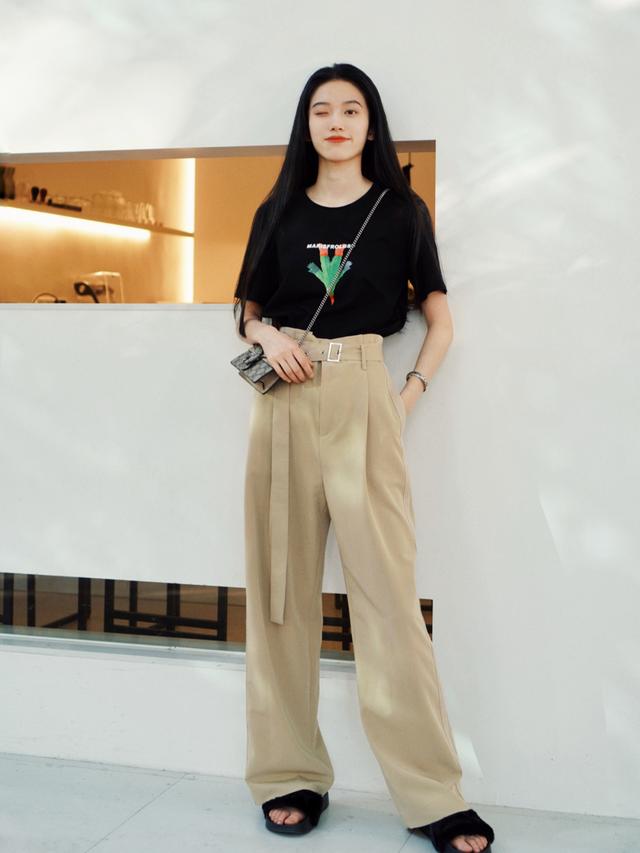 黑色印花短T搭配高腰拖地长裤,这一套穿搭也是夏天穿搭的标配之一,如果你喜欢穿高腰拖地长裤,那么一定知道这裤子特别的显身材比例,如果再搭配一件有趣的印花上衣,这样整个人看起来特别的显高显精神。