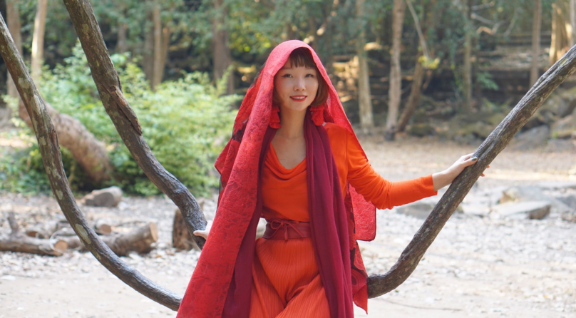 草原上用纱巾配合做动作,同时遮挡了刺眼的阳光