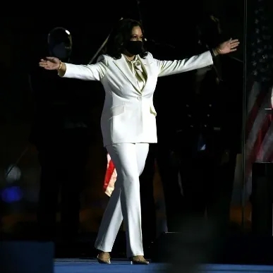 白套装,早已是华盛顿最强大的标志之一。作为美国第一位非白人的女副总统,成为世界上最强大女性的贺锦丽,显然知道自己会成为世界各地的拍摄拍照对象,又怎么可能不知道在宣布胜出的时刻穿什么呢?