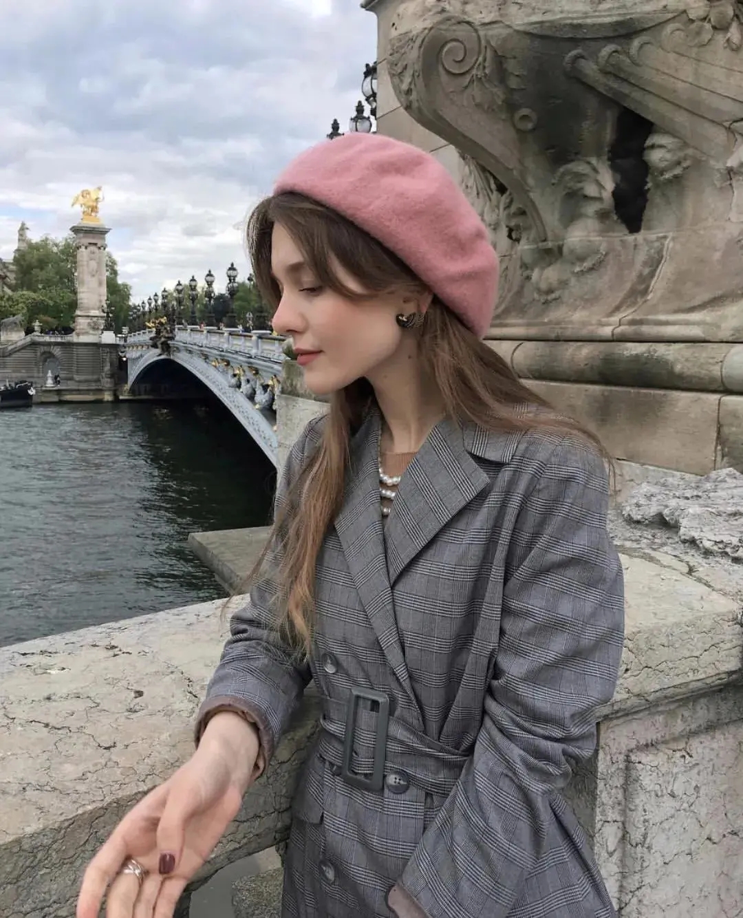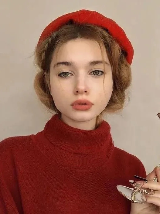 长脸的轮廓呈纵向分布,所以在佩戴贝雷帽时,可以把它轻扣在头后,借助刘海缩小脸部比例,整个人看上去温柔又气质。