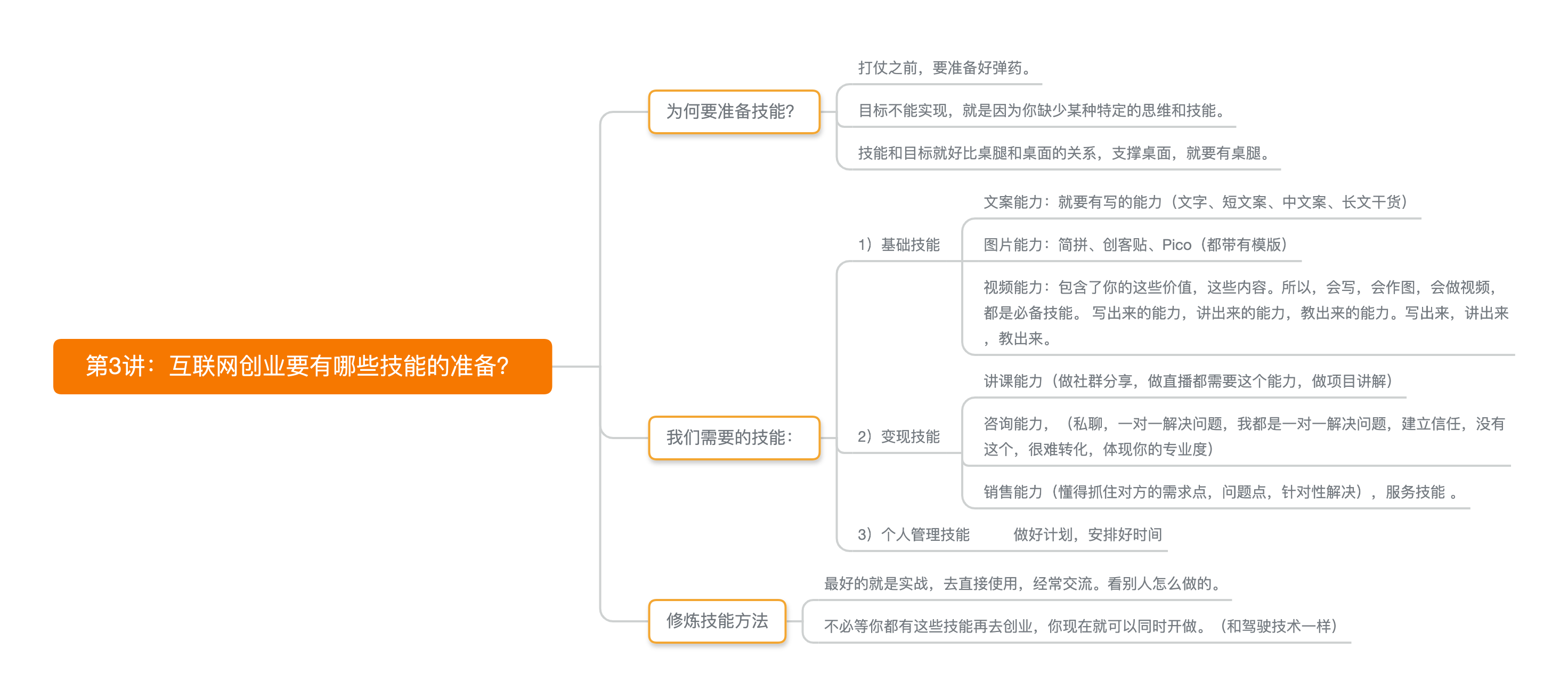 小结:本节课主要讲解互联网创业必备技能,包含基础技能,文案,视频技能,包含变现技能,讲课、咨询、销售、个人管理等。修炼技能的方法,最好的方法就是实战。