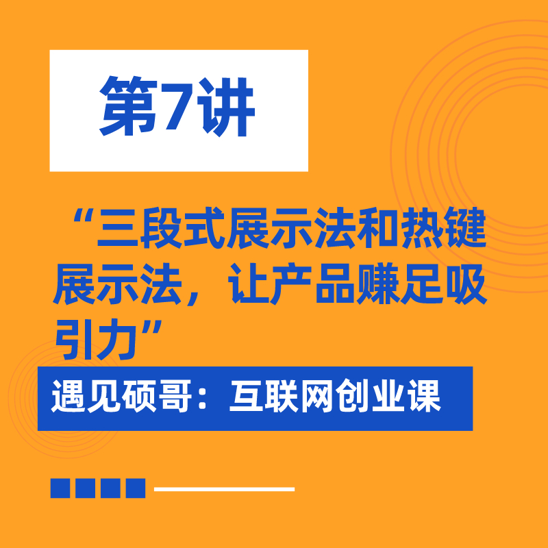 概述:第7讲:三段式展示法和热键展示法,让产品赚足吸引力大家好,我是硕哥!欢迎你来到互联网创业课!(为了便于大家快速高效学习,本课程的文字部分是简略版,并非是音频全文,建议参考简略版后获得课程大框架和内容全貌,重点以听课程音频学习为主)一、三段式展示法如何做好销售的展示,使用三段式展示