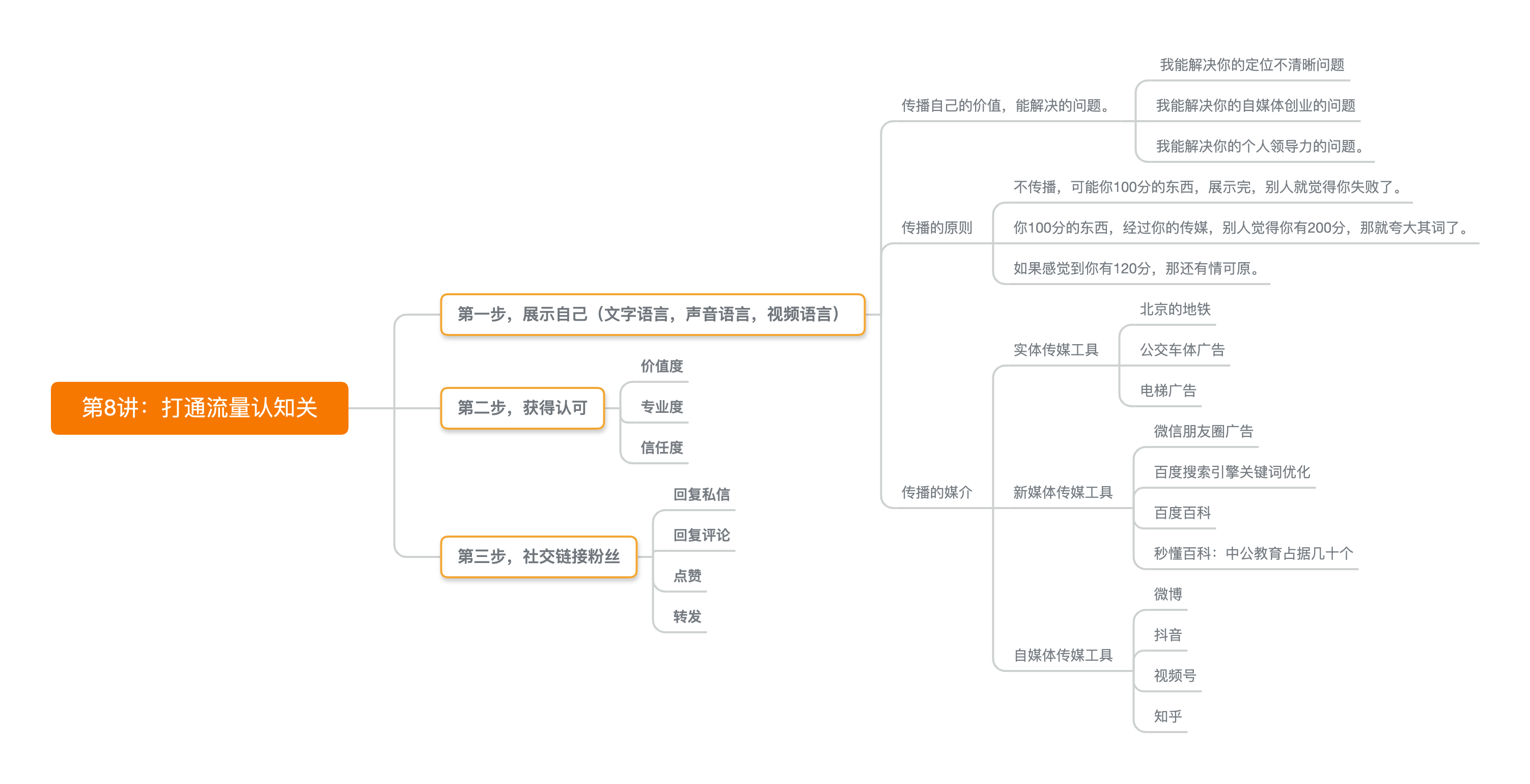 概述:第8讲:打通流量认知关大家好,我是硕哥!欢迎你来到互联网创业课!(为了便于大家快速高效学习,本课程的文字部分是简略版,并非是音频全文,建议参考简略版后获得课程大框架和内容全貌,重点以听课程音频学习为主)第一步:展示自己通过文字语言、声音语言、视频语言来展示。通过展示并传播自己的价