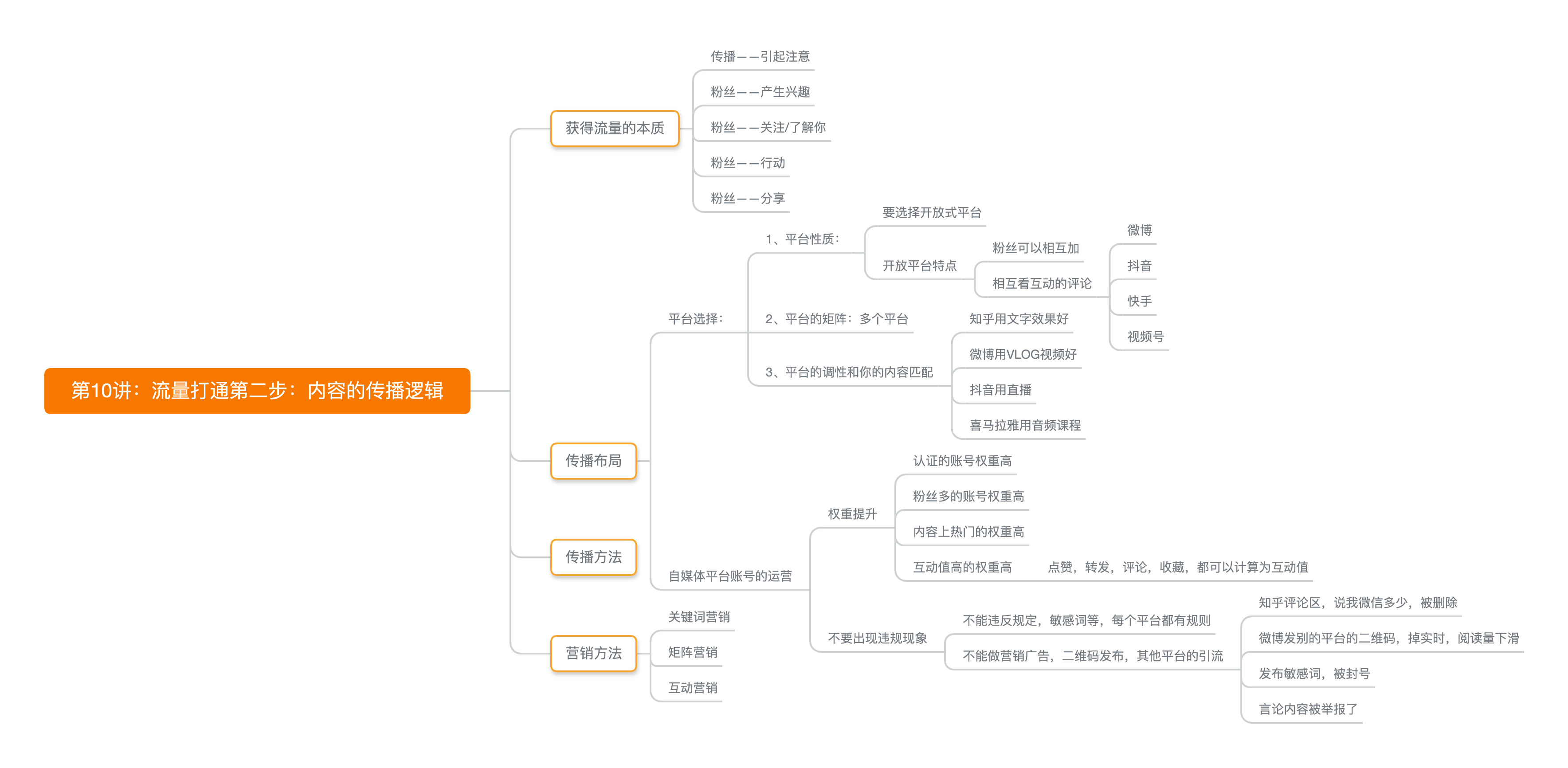 概述:第10讲:流量打通第二步:设计好内容的传播逻辑获得流量的本质传播,有引起注意。客户,产生兴趣开始关注,搜素了解你的东西然后行动然后分享。传播布局平台选择:1、平台性质:开放式平台,必须有。什么事开放平台?粉丝可以相互加,相互看互动的评论。讲几个例子,微博的平台,特点?抖音的特点,
