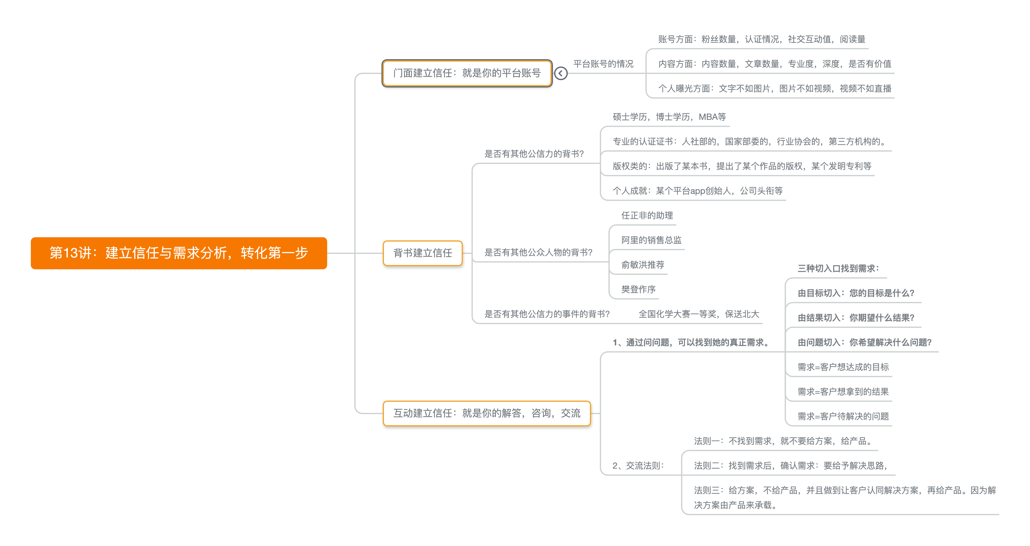 概述:第13讲:建立信任与需求分析,是转化的第一步门面建立信任:就是你的平台账号平台账号的情况账号方面:粉丝数量,认证情况,社交互动值,阅读量内容方面:内容数量,文章数量,专业度,深度,是否有价值个人曝光方面:文字不如图片,图片不如视频,视频不如直播背书建立信任是否有其他公信力的背书?
