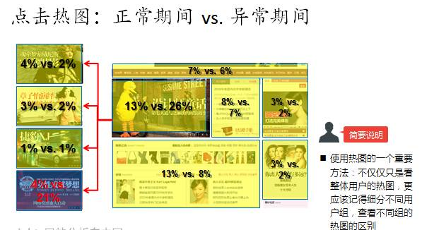 其二,细分人群的热图对比分析,例如不同渠道、新老用户、不同时段、AB测试的热图对比等等。
