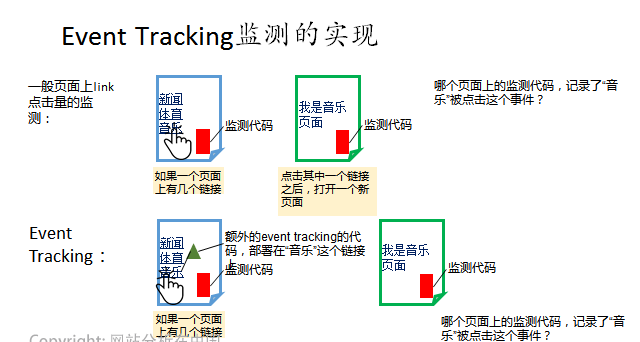 不过,有问题就一定有方法,人们发明了event tracking来解决上面的问题。event tracking本质上是对这些特殊互动的定制化监测,而由于是定制化,所以反而有了更多附加的好处,即可以额外添加对于这个活动的更多的说明(以event tracking这个方法的附件属性的方式)。结果,这个方法甚至有些反客为主,即使是一些http链接,很多分析老手也喜欢把它们加上event tracking(技术上完全可行),以获得更多的额外监测属性说明。
