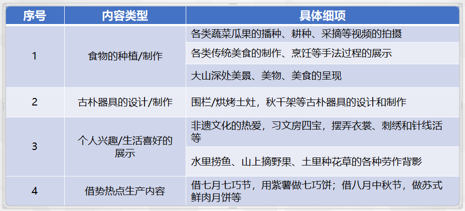 依旧来聊李子柒,在她的视频中,内容大致分为以下几类(下图表格):食物的种植/制作过程展示、古朴器具的设计/制作过程展示、个人兴趣/生活喜好的展示、借势热点等生产内容。