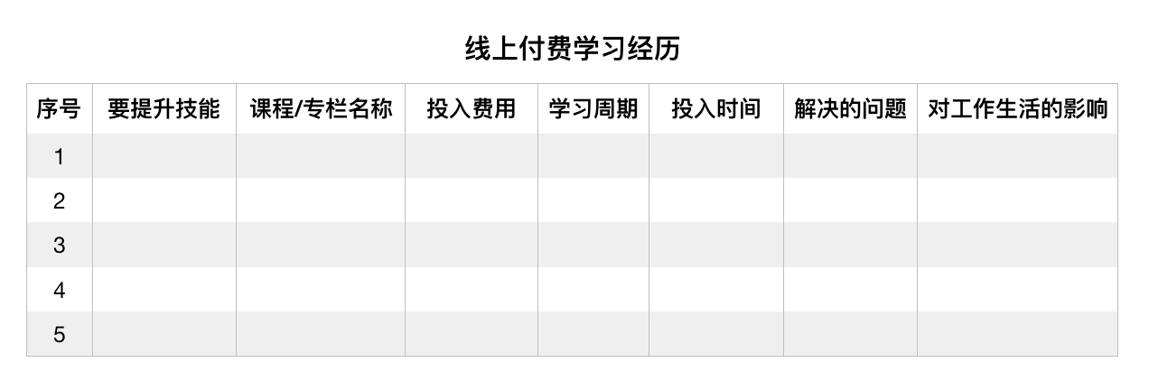 在开始行动之前,以线上付费学习经历为代表,梳理一下自己的现状,我为你提供了一个简易的表格。