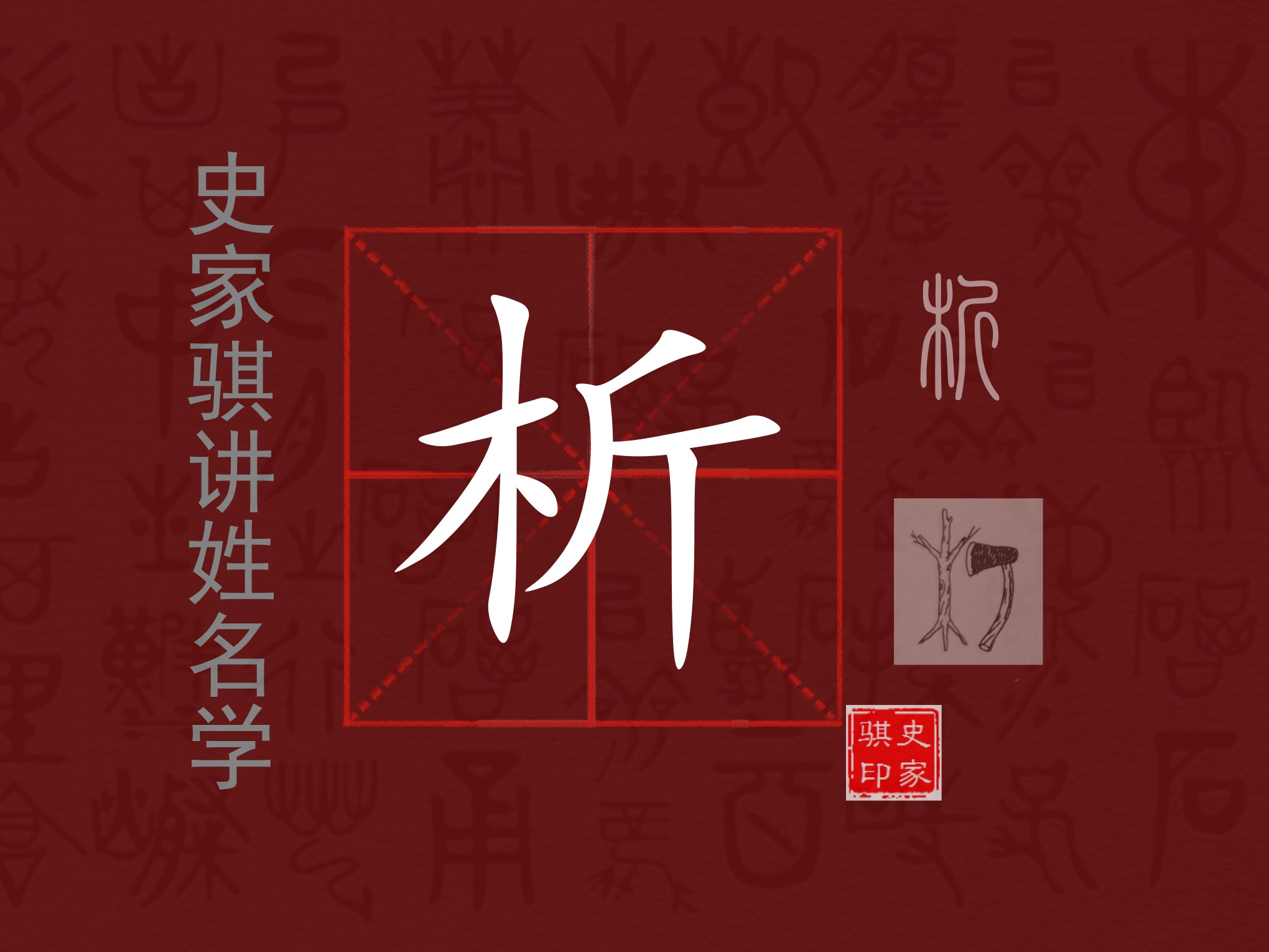 【析】是个会意字,从木、从斤(斧子),表示用斧子劈开木头,本义是用斧劈木,引申为分开、离散、分析、解释。