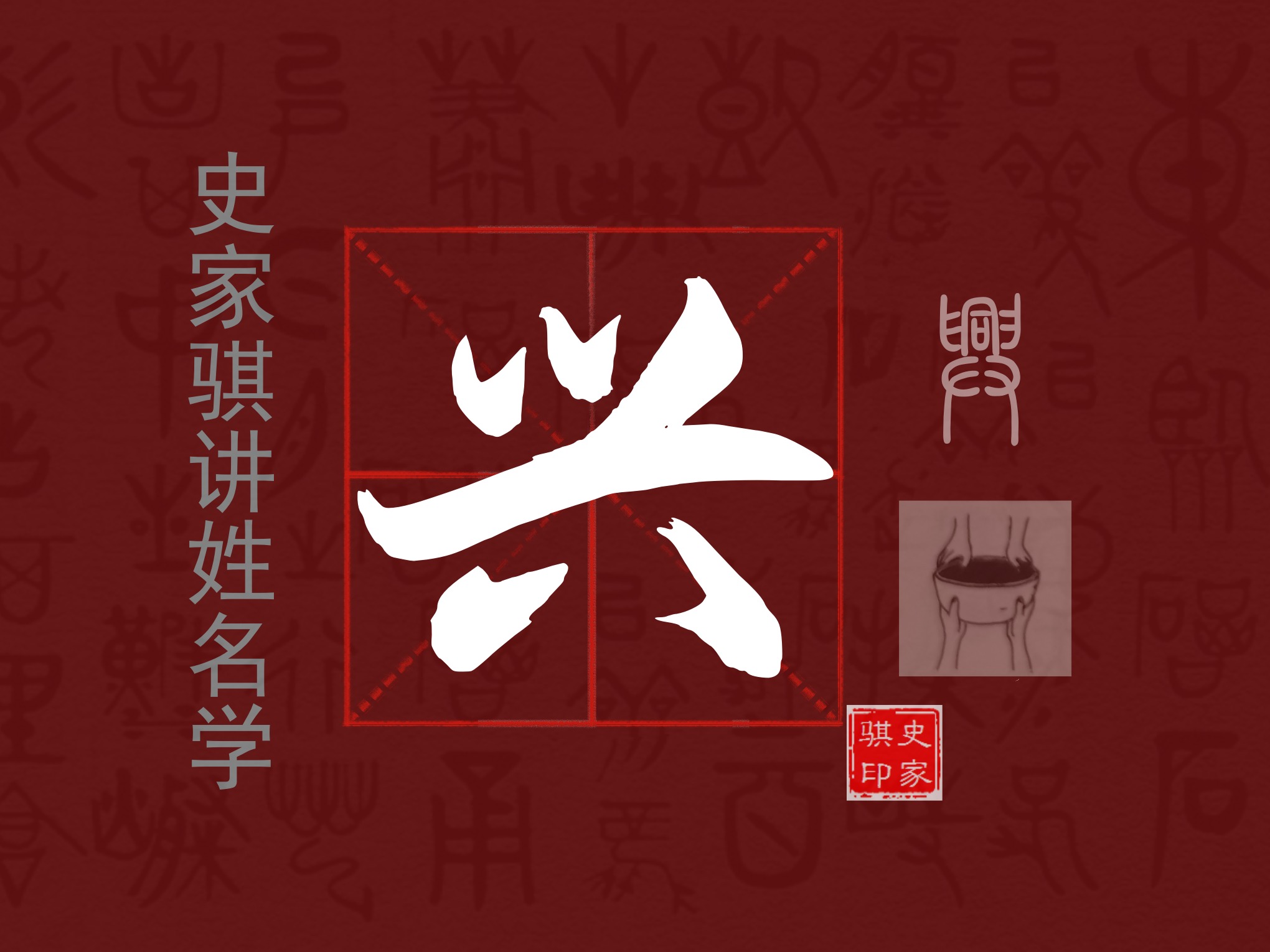 【兴】是个会意字,甲骨文形体像四手抬起器物,金篆隶楷从舁,代表四手共举,从同,表示众人齐喊以协同动作,用以表示共同举起。本义是举起、起,引申为开始、发动、兴盛、流行等义。