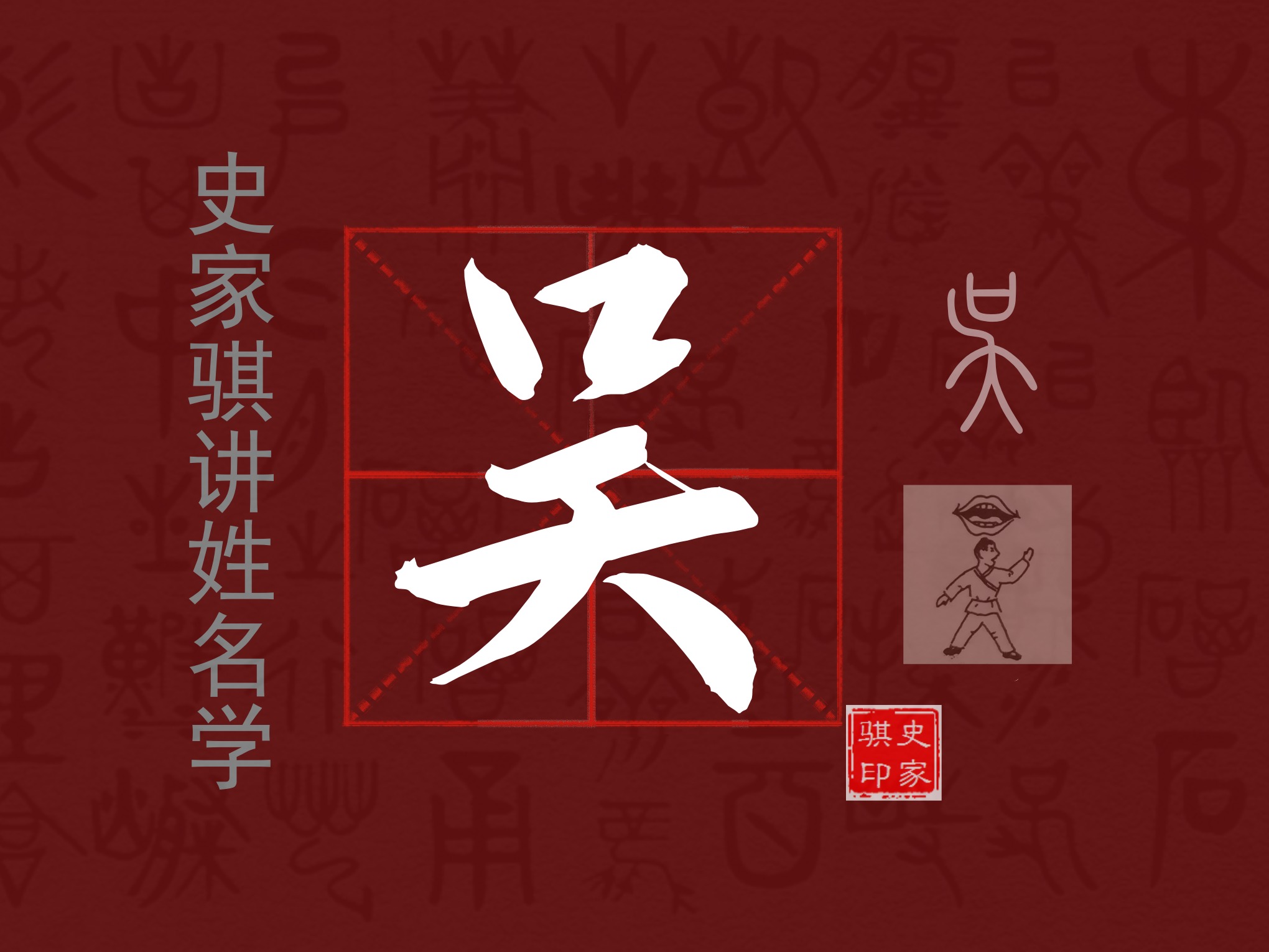 【吴】是个会意字,甲骨文上部是口,像张开的嘴,下部像打着手势的人,表示打着手势大声说话,隶书楷书从口从天,天代表大,表示大声说话。吴的本义是大声说话,假借为地名、国名和姓氏。