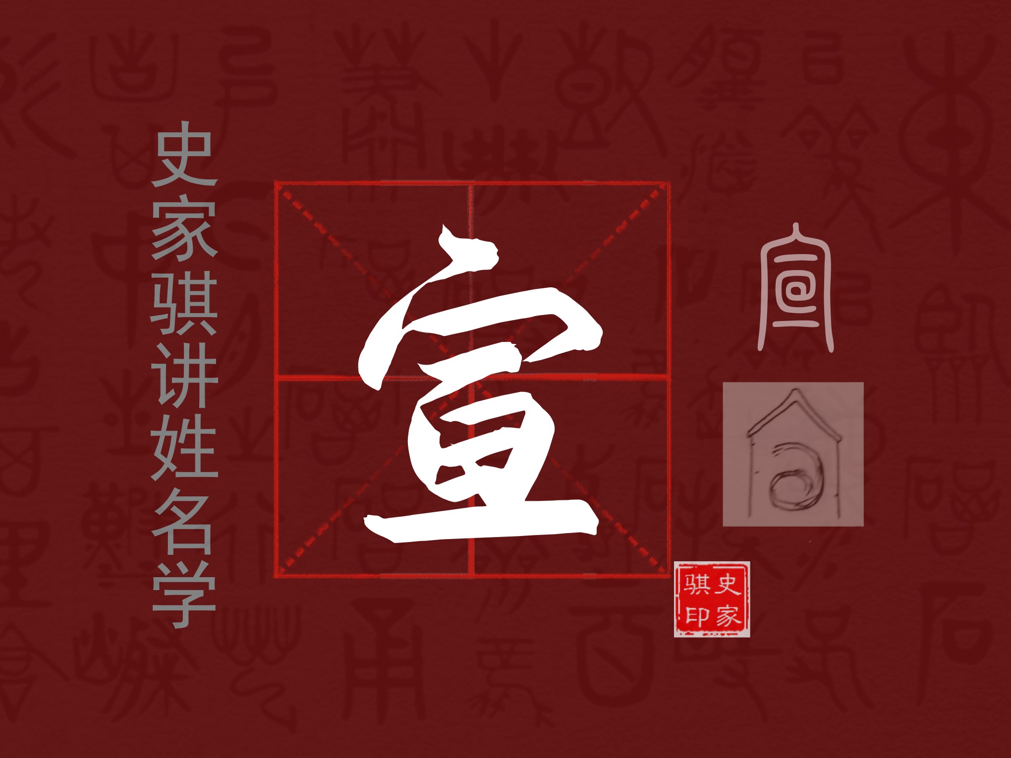 【宣】是个会意字,从宀,甲骨文、金文形体像房子,从亘,像回环旋绕,表示天子接见臣子之室大多回廊环绕。宣的本义是天子接见大臣的大室,引申为宣布、发表、公开说出、疏导等义。