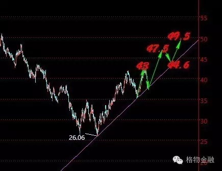 继续上图,也就是行情所处位置说明35.2美元上涨到42.42美元处于26以来的三浪上涨(或者C浪上涨),而且是起始阶段,所以,根本不存在所谓的M头