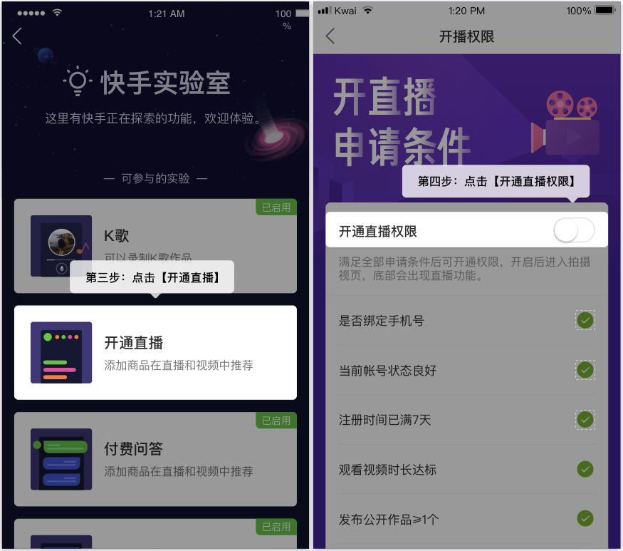 概述:开通直播功能:①快手 App 主页左上角点击【菜单-设置-实验室-开通直播】;②进入申请直播权限页面,按照页面提示,满足快手直播开放规则,即可开通快手直播功能。为了让您能够有更好的