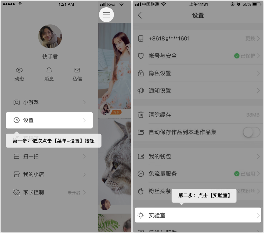 ①快手 App 主页左上角点击【菜单-设置-实验室-开通直播】;