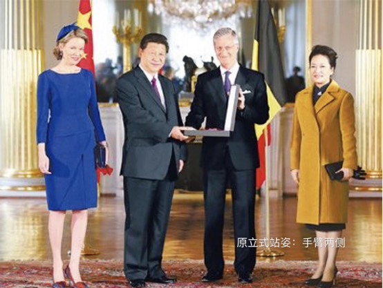女士:原则 站坐不开膝,双腿并拢无缝隙,或双脚一前一后形成小丁字都可以!切记切记,女士无论何时女士站立时都不可以双膝分开!下图是彭麻麻在接待他国夫人时的照片,站姿仪态谁的更为得体相信大家一目了然是吗?所以大家一定不要小看这些细节!