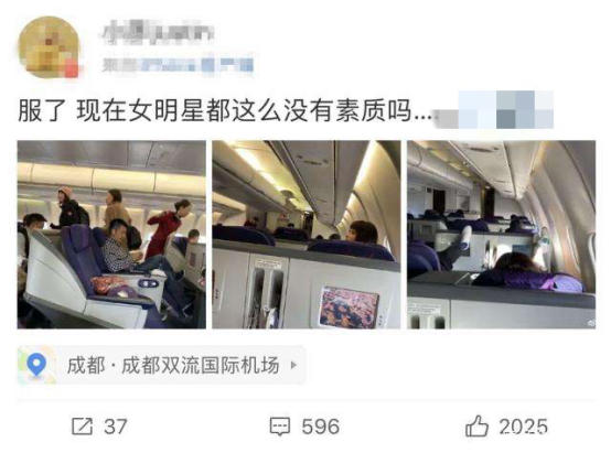记得,在去年1月份,一位网友在飞机上偶遇“著名女演员”,据这位网友爆料当时这位女演员找到了一个座位坐下,鞋子都没脱,然后双脚直接踩踏在前方后背椅的显示屏幕上。网友就立刻拍下照片,爆料在微博平台上直言:“现在的女明星素质都那么低下吗?”