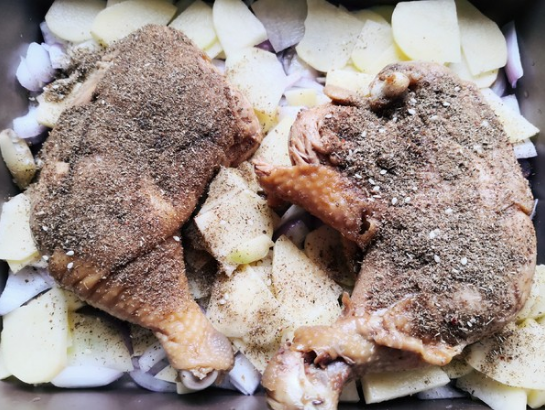 4.把腌制好的鸡腿放到土豆片上,再在两面都涂上烧烤料,烧烤料的品种以个人喜好为主,我的这个烧烤料以孜然为主,不辣,很好吃。