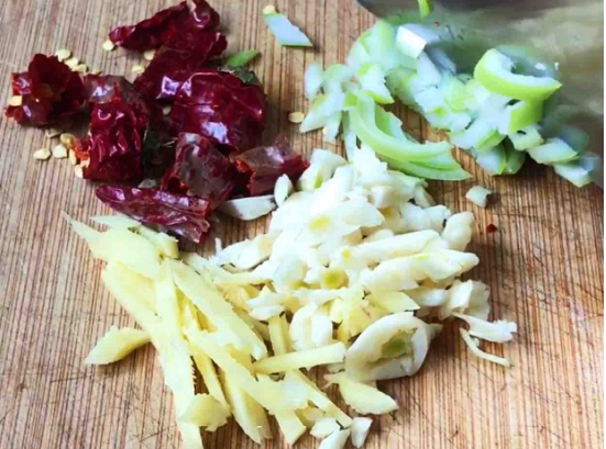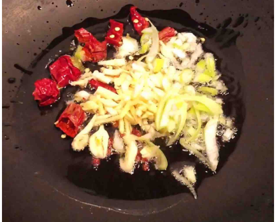 5.锅里油热放入葱姜蒜干辣椒爆香