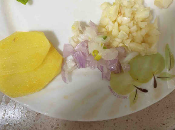2.生姜去衣切片 蒜头 干葱去衣切粒 备用