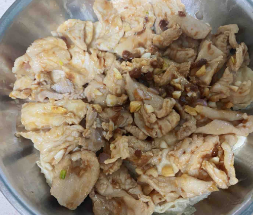 1.猪板筋洗干净 切片备用