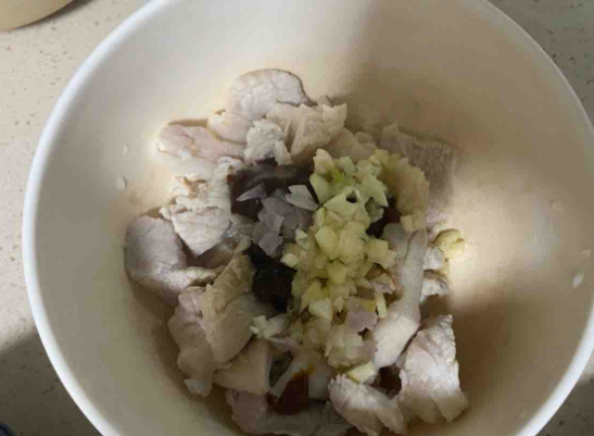 6.猪板筋下盐 糖 生粉 白胡椒粉 植物油 黄豆酱 蒜粒葱粒 搅拌均匀 腌10分钟
