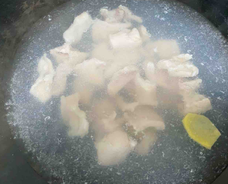 5.水烧开 下黄酒 生姜片 猪板筋 烫一下(不超过10秒) 捞起 用清水彻底冲洗干净 沥水备用