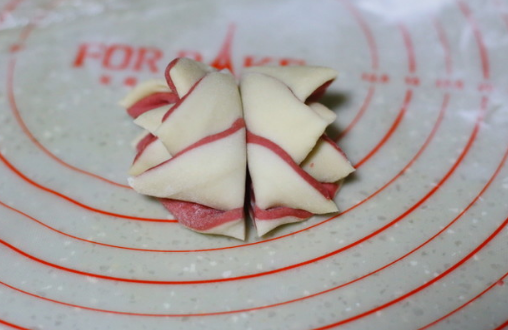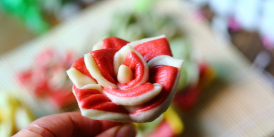 12.将切口朝下,将花的造型稍做整理,完成玫瑰花馒头坯子的制作;