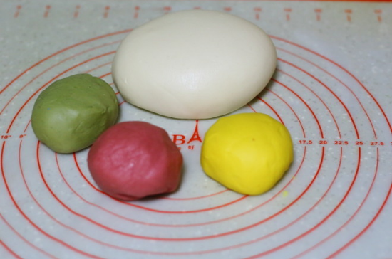 1.准备好所需的食材,先将白色面团所需的食材(普通面粉400g、白砂糖20g、清水200g、酵母4g)全部混合揉成光滑有弹性的面团,然后从白色面团中分别取3个小面团,每个约80g左右,3个小面团分别加入抹茶粉、红曲粉和南瓜混、面粉混合揉成绿色、红色、黄色面团。揉绿色面粉和红色面团时,先滴入几滴清水将抹茶粉和红曲粉融化开后再与白色面团混合揉均匀。南瓜泥中含水量加,与白色面团混合揉时需要加少许干面粉;