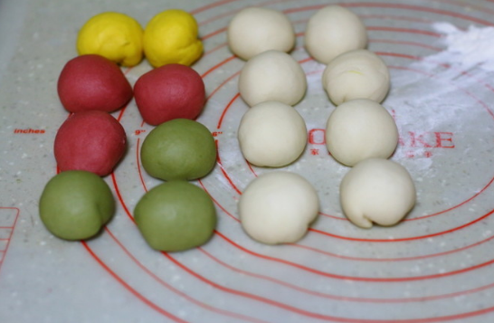 2.4种颜色的面团揉好后,再分成若干个小面团,每个面团约10g左右。白色面团不要全部分完,需要预留少许做玫瑰花的花心;