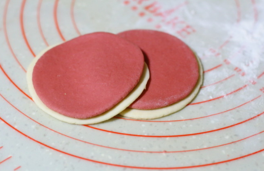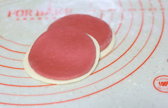 4.擀好的面皮两两叠加在一起(直径大的放底部,直径小的放在上面);