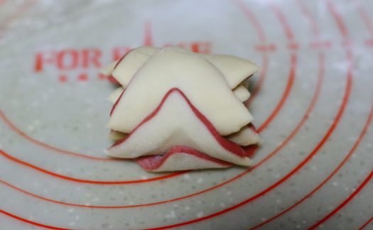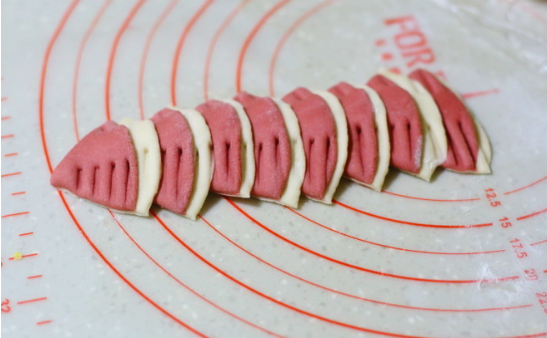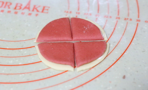 5.用刮板刀或水果刀从中间以十字架的方式切成四份;