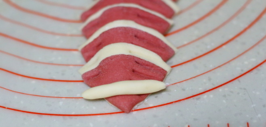 9.取少许白色面团搓成锥形,放在面皮的一端;