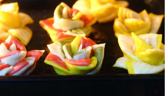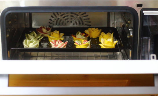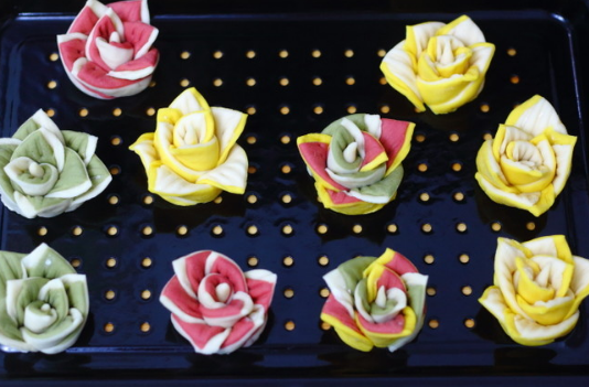 13.将制作好的玫瑰花馒头坯子放在刷了少许油的蒸箱盘上,按上述方法将剩余的面团全部制作完成;