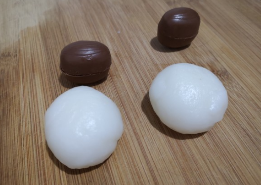 3.面团放凉后下手将其揉均匀,再分成多个小面团,准备好巧克力馅料。