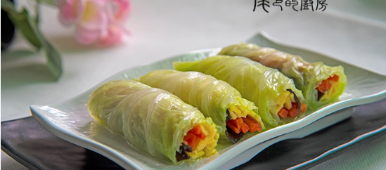 概述:1.白菜去老叶选择形状完整的大片叶子4片洗净放入开水中煮软,放凉后将菜帮片薄2.鸡蛋摊成蛋皮后切丝3.胡萝卜切丝,木耳切丝将胡萝卜丝、木耳丝放入开水中煮熟,放凉待用。4.将胡萝卜丝、木耳丝、蛋皮丝放在白菜叶上卷成卷两端切整齐,在盘中码放整齐。调味料兑成汁,浇在白菜卷上即可。
