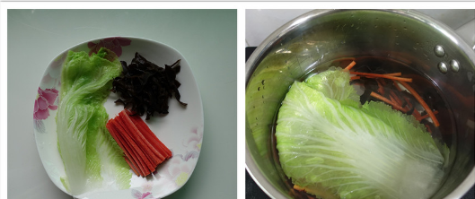 4.将胡萝卜丝、木耳丝、蛋皮丝放在白菜叶上卷成卷