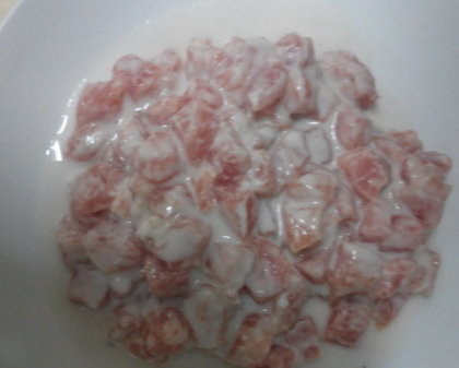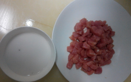 2.里脊切1,5厘米的小方块,淀粉用水泡上