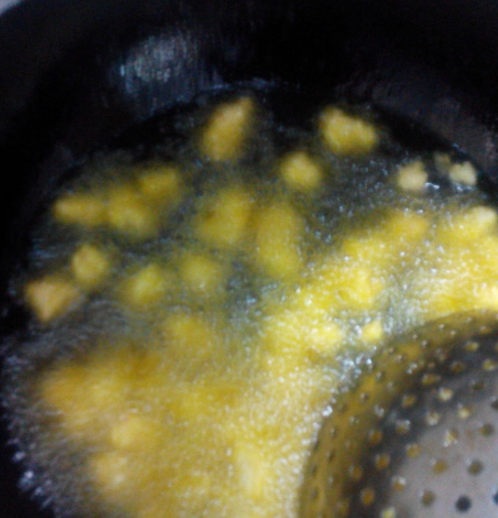 5.炒锅入油烧热,逐个下入,炸至定型,捞出,升高油温下入肉段复炸,至外皮焦脆捞出