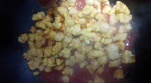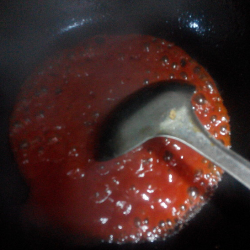 6.倒出余油,下入番茄酱炒至出酸味,倒入碗汁,加热至粘稠