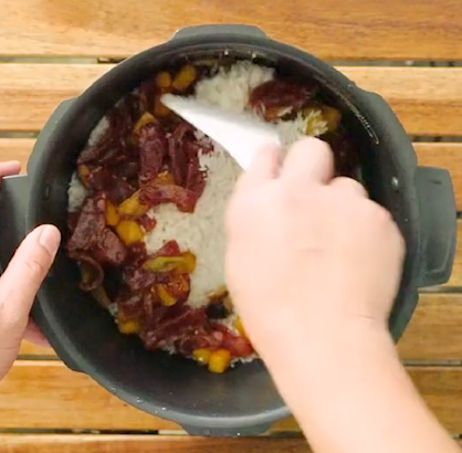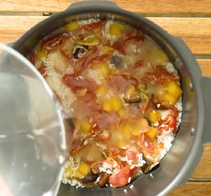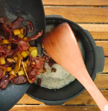 概述:1.锅底烧油 倒入大葱 生姜 香菇丁 土豆丁 腊肠 翻炒均匀2.倒入蚝油 生抽 盐3.炒至腊肠变卷即可4.大米泡一个小时 倒入锅内5.倒入炒好的腊肠6.搅拌均匀7.倒入清水 与食物平行8.打到煮饭模式9.完成