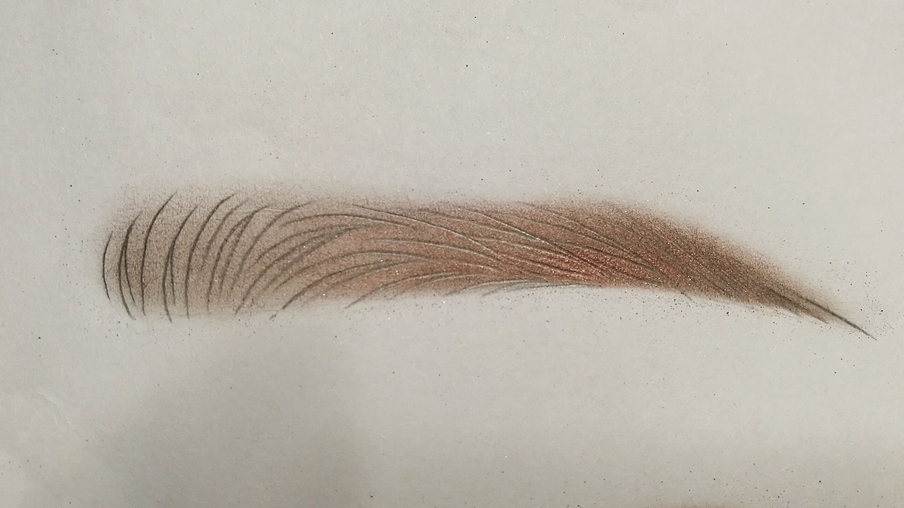 用眉粉勾画出略带弧度的眉型,然后填补残缺
