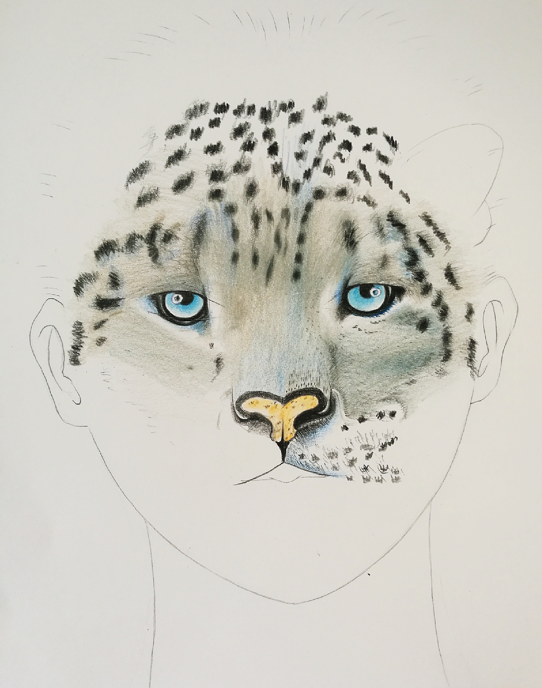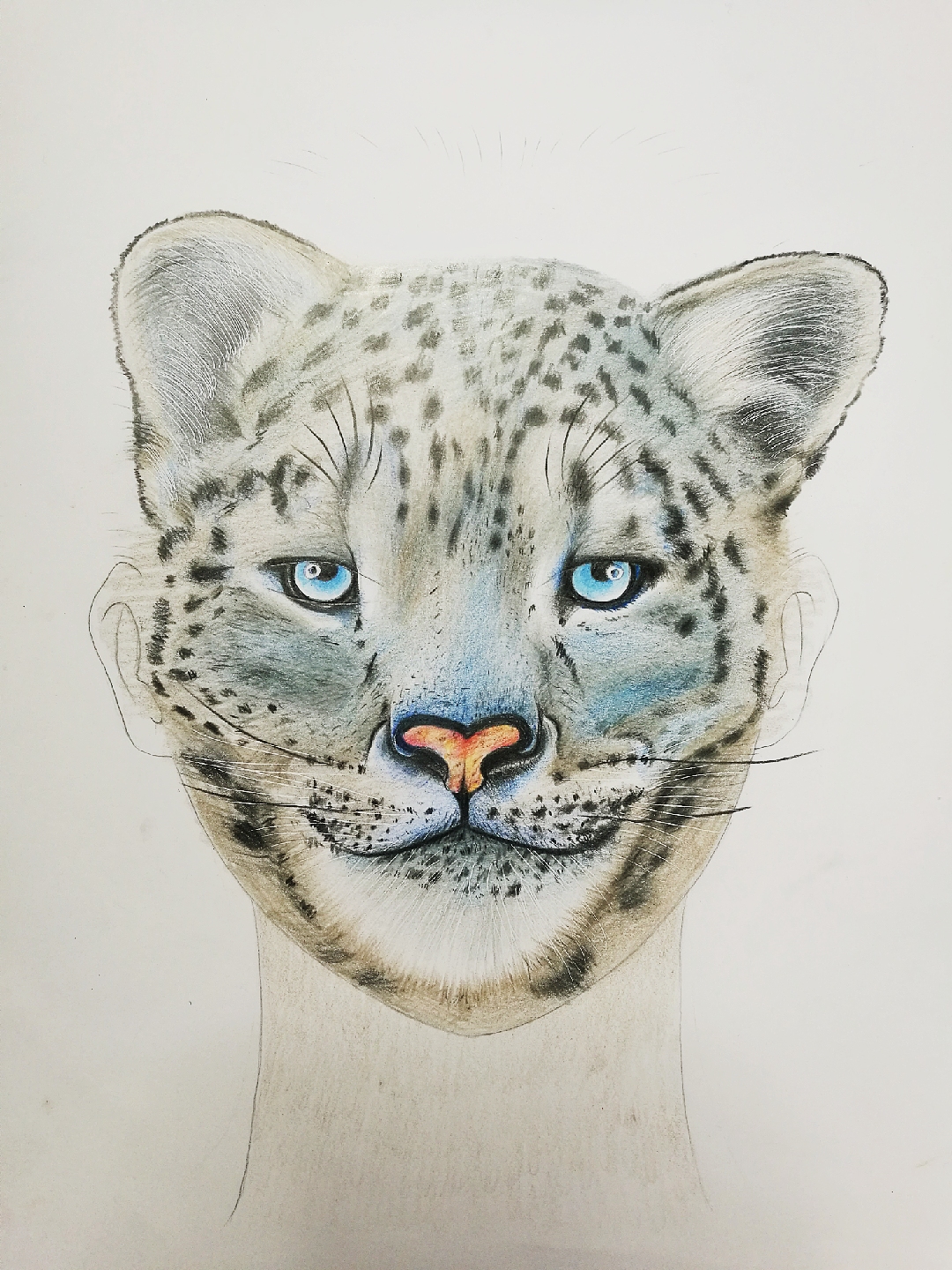 特点:掌握雪豹的面部特点:蓝色的眼睛,眼睛圆,瞳孔偏上,鼻子宽,鼻头有大多动物的特征,嘴巴呈人字型,脸型呈菱型脸,眉头眉毛长,胡子长,耳朵呈圆形,花纹成扁椭圆型。