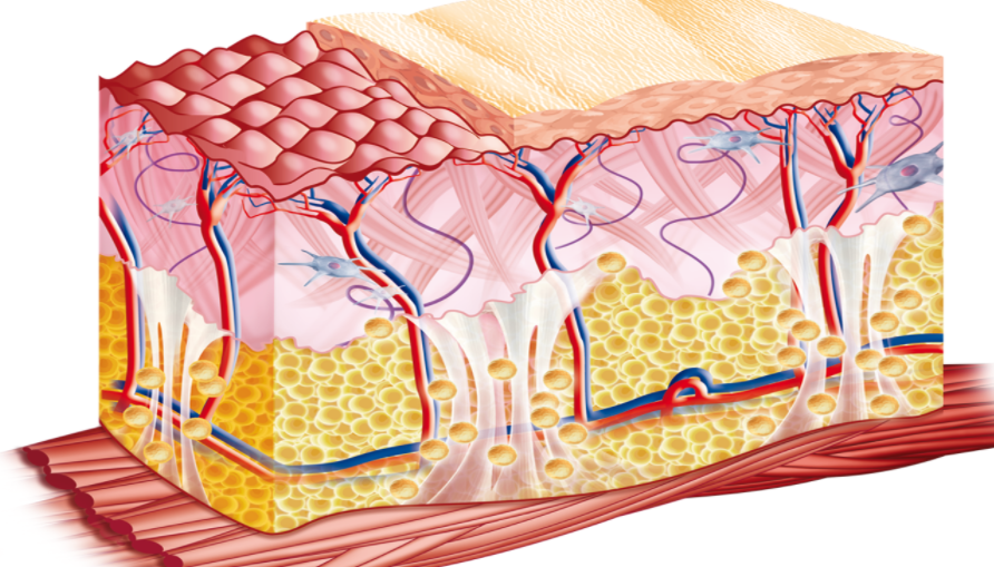 真皮中,密集排列的胶原纤维和缠绕在其中的弹力纤维就像深层皮肤中的“ 床垫” ,它们的支撑使皮肤有弹性、饱满、平滑。